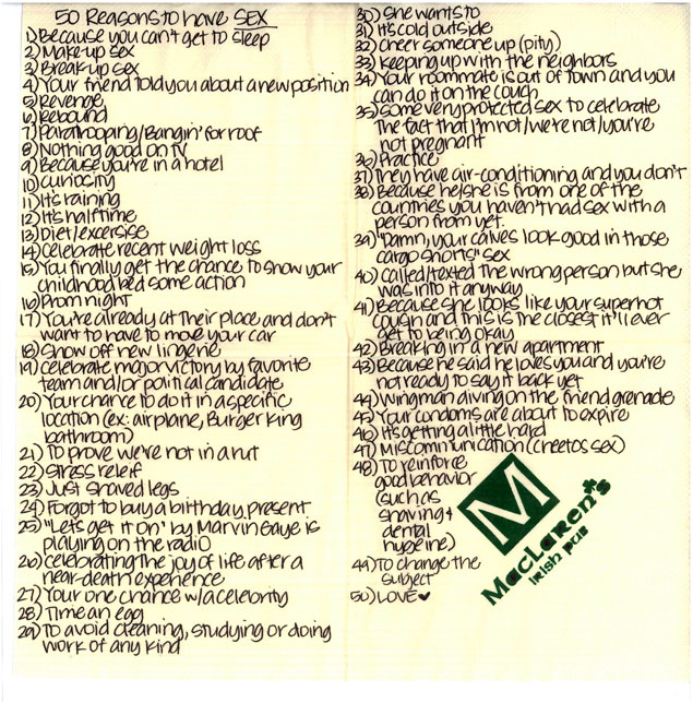 En la serie How I met your mother, el capítulo The naked man, Lily le promete a su esposo listarle 50 razones para tener sexo... Marshall tiene el mal tino de no creerle pero ¡Aqui están!